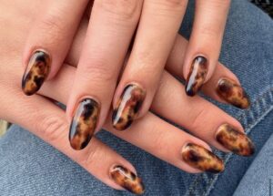 Σύμφωνα με τη nail artist Jin Soon Choi, τα tortoise shell nails συνδυάζουν δύο τάσεις σε μία: jelly βάση και από πάνω το χαρακτηριστικό print. Το αποτέλεσμα θυμίζει το φυσικό μοτίβο του καβουκιού της χελώνας, με αποχρώσεις πορτοκαλί, καφέ και μαύρου να ανακατεύονται μεταξύ τους.