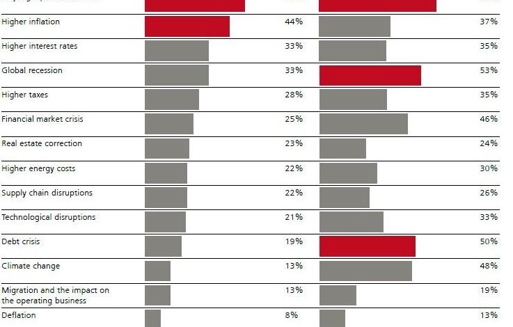 Η δεύτερη μεγαλύτερη ανησυχία για περισσότερους από τους μισούς (52%), ήταν η μείζων γεωπολιτική σύγκρουση, ακολουθούμενη από τον υψηλότερο πληθωρισμό.