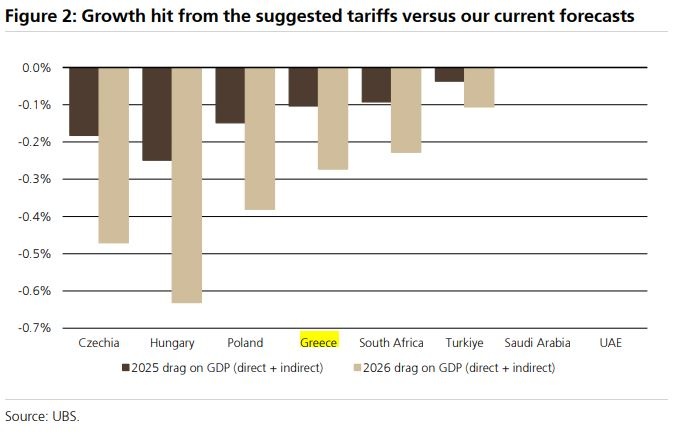 Όσον αφορά τον έμμεσο αντίκτυπο, η «ανάλυση ευαισθησίας» της ευρωπαϊκής οικονομικής ομάδας της UBS, αναφέρει πως το πλήγμα στο ΑΕΠ θα ήταν c10bps το 2025 και c30bps το 2026 στην περίπτωση που εφαρμοστεί ο δασμολογικός συντελεστής 30%.