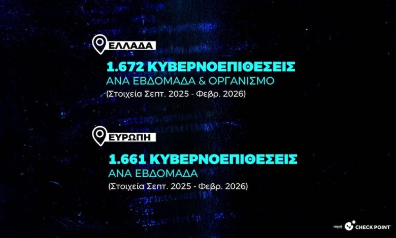 Σύμφωνα με τα πιο πρόσφατα στοιχεία της κορυφαίας εταιρίας κυβερνοασφάλειας Checkpoint για την Ελλάδα, το διάστημα Σεπτεμβρίου 2025 – Φεβρουαρίου 2026, ένας οργανισμός δέχθηκε κατά μέσο όρο 1.672 κυβερνοεπιθέσεις την εβδομάδα.